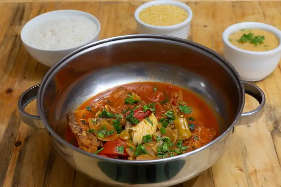 Escabeche ao molho da chefe, acompanha arroz branco, pirão e ovo