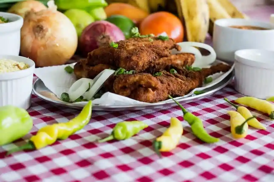 Filé de tambaqui a milanesa, baião de dois ou arroz, farofa, vinagrete, limão e pimenta